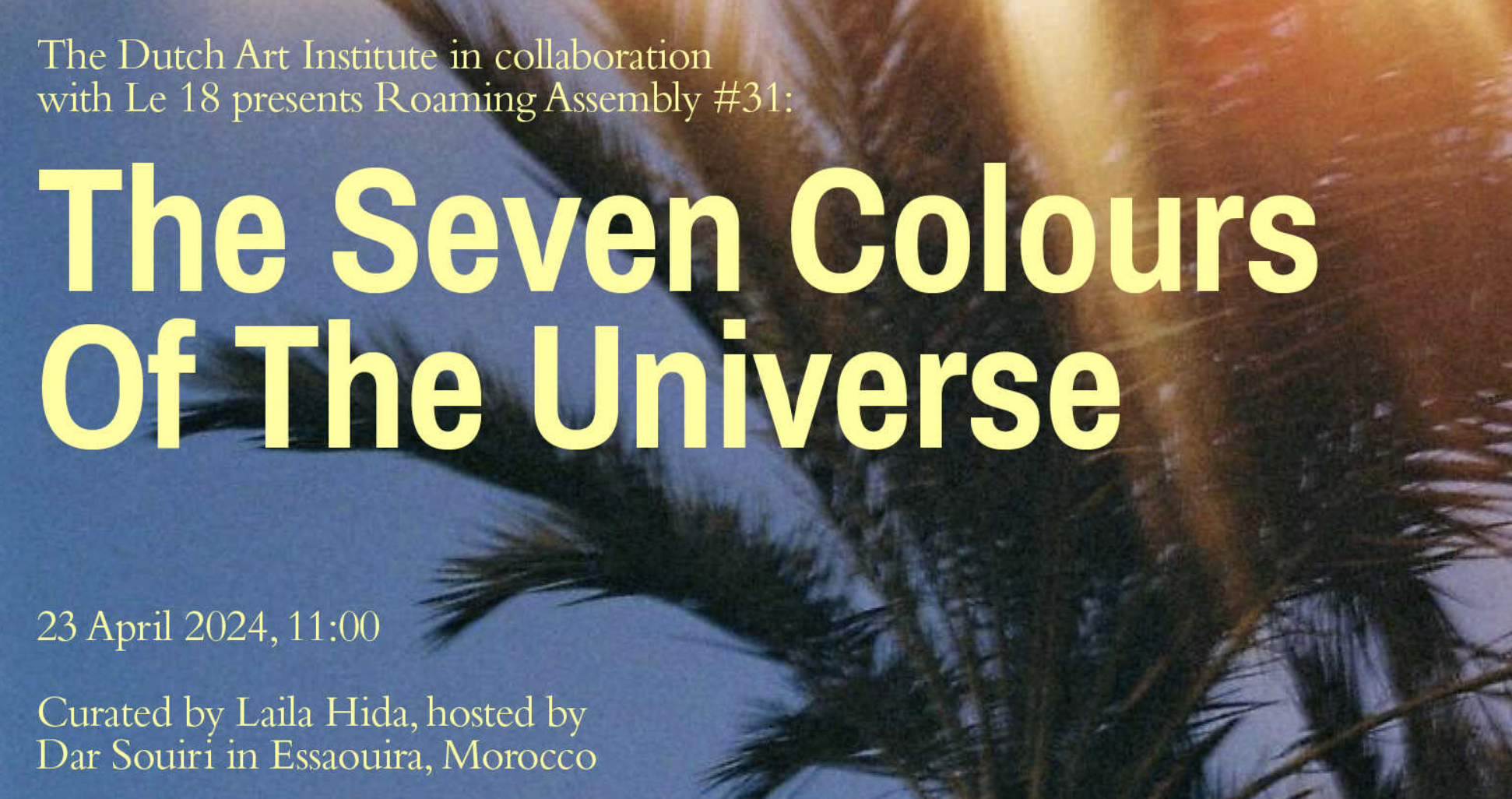 2024 ~ Essaouira, Morocco: Roaming Assembly#31 ~ The Seven Colors of the Universe. A collaboration between DAI and Le18, Marrakech. Curated by Laila Hida and hosted by Dar Souiri in Essaouira.