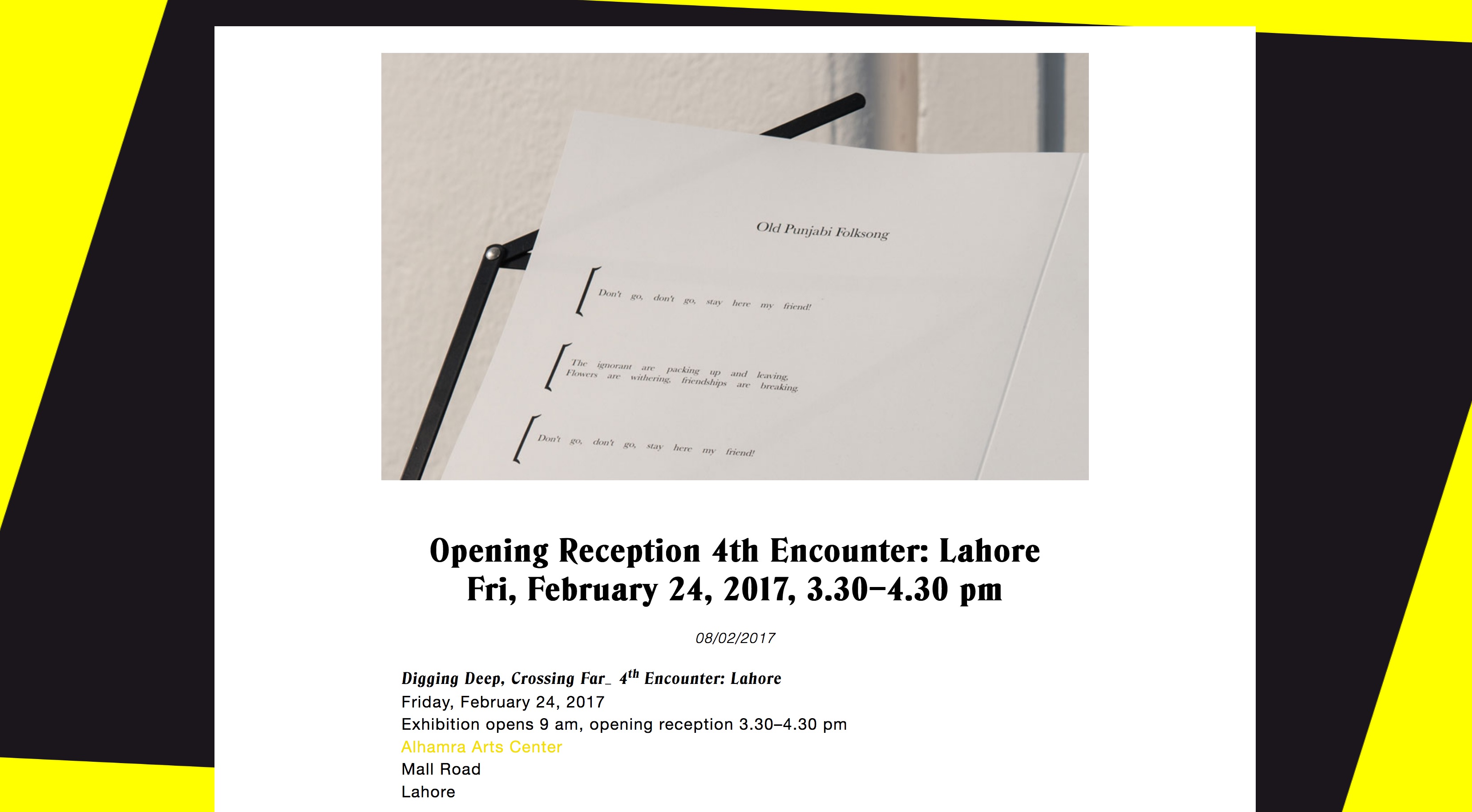 The Exhibition “Digging Deep, Crossing Far_ 4th Encounter” will open at Alhamra Arts Center in Lahore.
