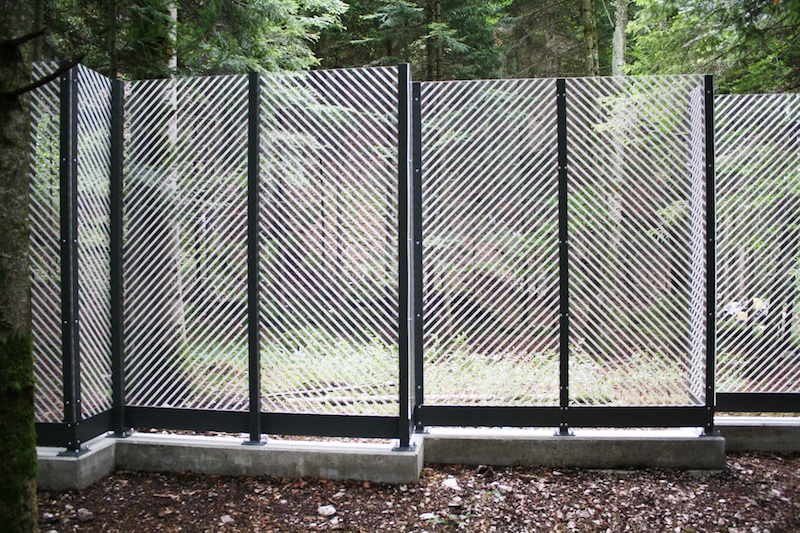 The installation Reversible Sound Wall is an eight-meter-long transparent acoustic screen, constructed according to European industrial standards typically used for highway noise mitigation in residential or natural areas. The wall has been erected in a secluded forest location, surrounded by a quiet, diffuse natural sound field with no immediate human-made noise sources. The construction’s visual function is brought to the fore; the transparent screen acts as both a frame for the landscape and a mirror reflecting it.
